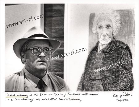 " David hockney at the salts mill gallery in saltaire with one of his 'new drawing' of his mother Laura Hockney"